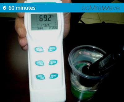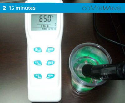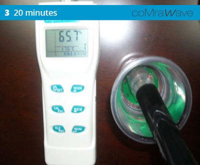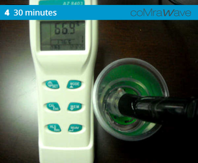A sample of the control water (tested at 55% dissolved oxygen) at ambient temperature, responded to the coMra Wave technology by making an additional 15% of the dissolved oxygen available in the active dynamics of the water structure.