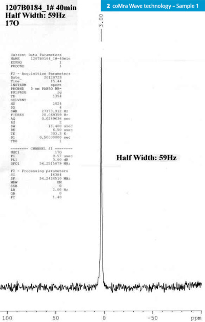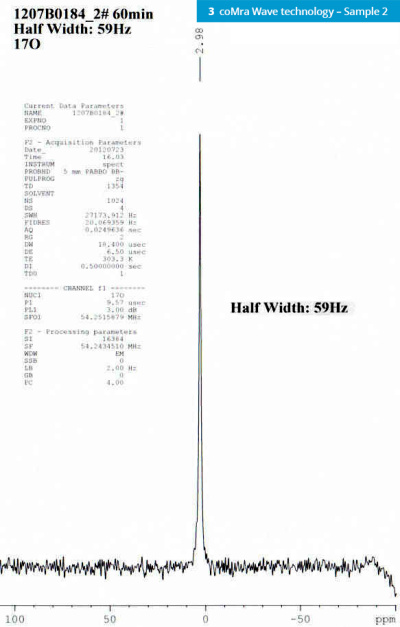 The NMR results show that the coMra Wave technology transformed the water with new tested line width of 59Hz, closer to that of natural water dynamics.